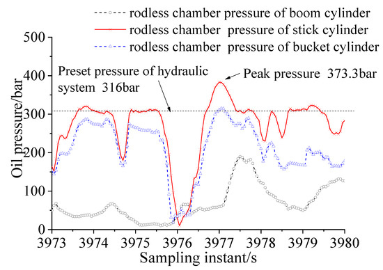 It can be seen from Figure 3 that the pressure in the rodless chamber of the stick cylinder exceeded the preset pressure 316 bar, which is the main safety valve of the system and was obtained through the maximum digging force test. The overflow phenomenon also occurred: the measured peak pressure exceeded the set pressure of the system, then gradually attenuated and fluctuated, and finally stabilized at the rated pressure. This phenomenon is caused by the dynamic characteristics of the relief valve when the main safety valve suddenly changes from the closed state to the rated pressure state. This phenomenon occurred many times in the whole load spectrum test process, which indicates that the extreme load had been captured in the load spectrum test.