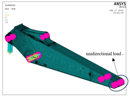 The finite element model of the stick was established in the finite element analysis software, ANSYS R15.0. The two kinds of load spectra to be applied were unidirectional load. Therefore, in the model, the 5 degrees of freedom of the hinge point of the stick and the boom and the 5 degrees of freedom of the fixed end of the stick cylinder rod were constrained, respectively. Then, the unit vertical force was applied at the hinge point of the stick and the bucket, as shown in Figure 5.