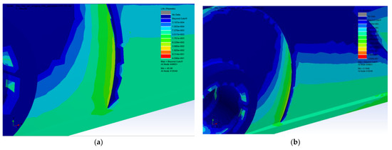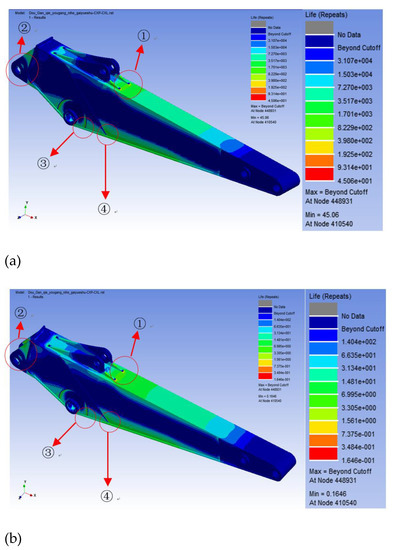 Figure 6 compares the overall life distribution cloud diagram of the stick structure under the action of the two load spectra. It can be seen that the life distribution of the stick structure was basically the same, and there were four areas with short life: ① The front end of the bucket cylinder support ear plate located on the upper wing plate of the stick; ② Near the reaming hole on the ear plate of the stick cylinder support; ③ Part of the weld near the reaming hole of the stick and the boom; ④ Intersection of butt weld on the web and the lower flange of the stick. The comparisons of these four areas with local enlarged figures are shown in Figure 7, Figure 8, Figure 9 and Figure 10, respectively.