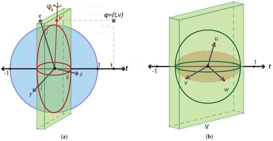 Quaternions are a form of four-dimensional algebra that lets us represent rotations in a simple way [29]. Every quaternion can be visualized in the diagram of Figure 1a, where the blue sphere is the sphere formed by all unit quaternions (i.e., ), and the green box is the usual vector space. Any quaternion q has a component on the t-axis and a projection in the vector space. Such a projection has a unique vector representing the rotation axis in the vector space.