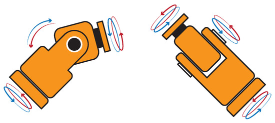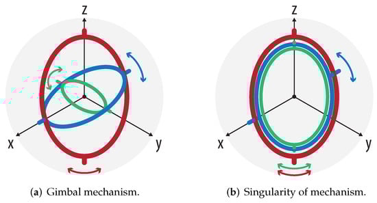 Euler angle representation is very useful because it adapts perfectly to the gimbal mechanism, as shown in Figure 5a, and can be adapted to the mechanism presented in Figure 3. However, the main problem of this mechanism is that it has singularities; i.e., when two different rotation axes are aligned, the mechanism loses a degree of freedom, as displayed in Figure 5b; the green axis rotates in the same direction as the red axis. In short, this implies that there are infinite solutions that put the mechanism in a particular configuration. Another popular representation for orientation is “roll-pitch-yaw”, also called Tait–Bryan angles, which is used in drones.