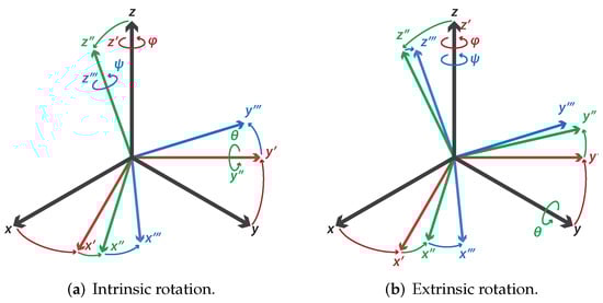 We use the z-y-z configuration for Euler angle notation, since it is used in most industrial robot manipulators. The letters z-y-z are the sequence of axes on which the rotations are made. Nevertheless, there are two ways to do this procedure, known as extrinsic and intrinsic rotations [31]. An extrinsic rotation applies rotations around the axes z-y-z belonging to the body frame, as shown in Figure 4a. On the other hand, an intrinsic rotation involves rotations around the axes z-y-z belonging to the general reference frame, as displayed in Figure 4b.