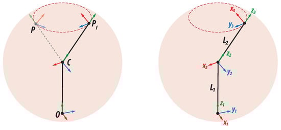 Equations (27)–(29) could be considered as the description of the orientation with Euler angles, but in a rational way, since they do not contain any transcendental functions. The parameters involved in the calculation of the orientation are and , where is a parameter obtained with Equation (2).
