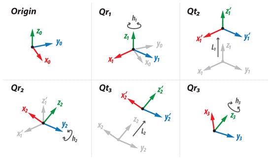 Computing all multiplications according to Equation (17), we obtain a unique dual quaternion whose components transform the original vector V into . Figure 7 shows each transformation independently, beginning from the origin frame and ending in the final frame of the wrist mechanism. Note that does not appear, since the first joint is on the origin of the reference frame.