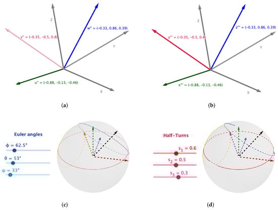 Simulation of different rotation techniques. (a) Intrinsic rotation, where rotations were performed around the body reference frame with parameters ϕ = 111°, ɵ = 67°, and φ = 60°. (b) Extrinsic rotation, where rotations were performed around the general reference frame with parameters ϕ = 60°, ɵ = 67°, and φ = 111°. (c) Classical rotation algorithm with three parameters given in angles. (d) Rational rotation algorithm with three parameters given in rational form (half-turns).