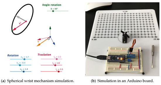 For Euler angle implementation, we used a graphical software called GeoGebra. Figure 8a,b show the implementation of intrinsic and extrinsic rotation, respectively. On other hand, Figure 8c exhibits the classical implementation of Euler angles using Equations (24)–(26). Finally, Figure 8d displays the rational replacement for Euler angles using Equations (27)–(29). The simulation of the wrist mechanism with dual quaternions is presented in Figure 9a. Additionally, the rotation algorithms for one axis were implemented in an Arduino-nano board, in order to prove how they work in real life after compiling them in the Arduino IDE software, as pictured in Figure 9b.