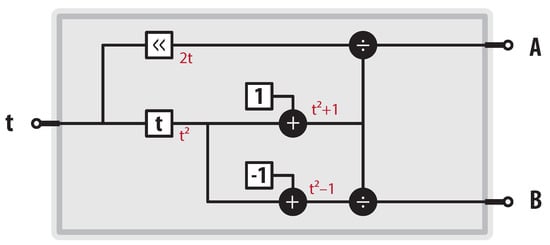 The first step for computing the final orientation of the gimbal mechanism is to find the rotation generated through a single axis. However, to easily calculate the final orientation of each rotation, we must compute the coefficients involved in each. Figure 10 depicts how to compute the rational replacements for the transcendental functions sine and cosine according to Equation (5). Notice that output A is the rational analog for the sine function and output B is the rational analog for the cosine function.