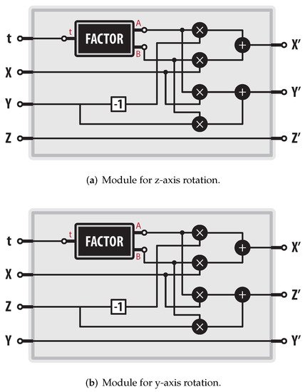Because the gimbal mechanism uses the Euler angles in the z-y-z sequence, we can compute the final orientation using the modules presented in Figure 11. The module displayed in Figure 11a computes the rotation on the z- and the module shown in Figure 11b computes the rotation on the y-. Notice that the module named “FACTOR” is the module depicted in Figure 10.