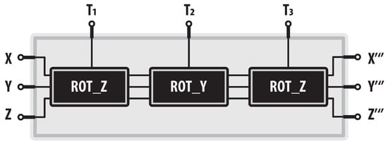 where , , and are the magnitude of rotation according to Equation (2). Finally, by computing and simplifying, we obtain a rational model for Euler angles.
