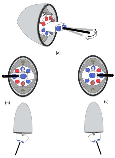 Magnetic mechanism. The micro DC gear motor placed inside the head gives rotative motion to a plastic disc. Permanent magnets were inserted into the disc (a). The magnets on the right and left sides of the disk had opposite polarities (represented by red and blue). The oscillating unit had one magnet on each side with the same polarity orientation (represented in blue). When one of these magnets is attracted to those on the disc, the other is repulsed. The plastic rod (represented in black) always points to the side of the attracted magnet (b,c).