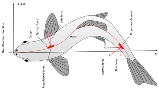 Equation (1) describes a body wave traveling from head to tail in a body-fixed coordinate system with the abscissa positive towards the tail (Figure 3), the linear and quadratic coefficient of the wave amplitude, is the body wave number in which represents the wavelength, is the wave frequency, and denotes time. Parameters and can be adjusted to achieve the desired body-caudal fin (BCF) swimming mode (Table 2). In this work, the reported values from [6,36] were used to model the traveling wave, and mimic fish swimming [39].