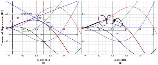 Different colors have been used to draw the midline of the fish body at different instants of time. The used tail beat frequency is 1 Hz. It has been considered half a period (e.g. 0.5 s). Black curve corresponds to 0.1 s, purple curve to 0.2 s, green curve to 0.3 s, red curve to 0.4 s, and orange curve (nearly symmetric to black curve with respect to the x-axis) corresponds to 0.5 s. (a) The maximum angle of deflection of the mid line during the waving motion is investigated, and corresponds to 52°, (b) The mid line at its maximum angle of deflection can be well approximated using two joints.