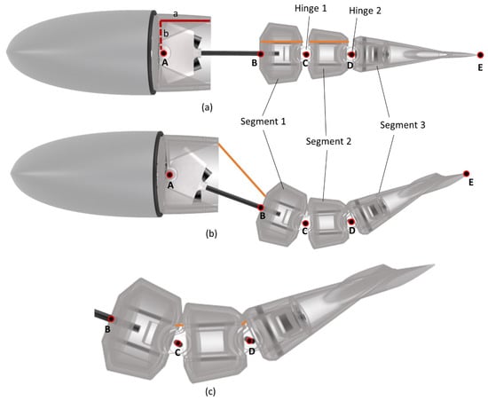 Rendering of the robotic fish with straight position (a), bended position (b), particular of segments during bended position (c). Segments and joints are clearly shown. Point A represents the rotation hinge of the whole posterior part of the robotic fish, Points C and D represent the hinges of relative rotation between segments, and Points B and E are the starting point of Segment 1 and the final point of Segment 3, respectively.