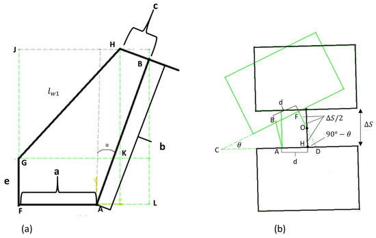 These wire parts are highlighted in orange in Figure 5c. For the calculation, the schematic of Figure 6b was used. Black blocks represent the relative position of segments when the robotic fish body was in straight configuration, while green was used to represent the relative position of segments when the fish body was in maximal bending configuration. In this latter case, angle was equal to as already specified. In the schematic, the short wire part between segments is represented by , and the depicted situation was repeated twice: between Segments 1 and 2, and between Segments 2 and 3.
