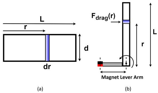 To select the appropriate magnets, the total drag force on the fish undulating tail was calculated. The fish body was simplified as a rectangular plank (); with reference to Figure 7, the worst-case drag for maximal transversal velocity () was considered. The equations to express hydrodynamic drag and the associated hydrodynamic torque are shown below: