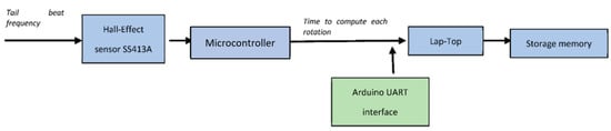 Rotations per second of the magnetic disc were recorded using a hall-effect sensor (SS413A), while data were read with a microcontroller (Arduino Mega board). Then, data were transmitted in real time to a laptop by means of the universal asynchronous receiver–transmitter (UART) interface of the microcontroller.