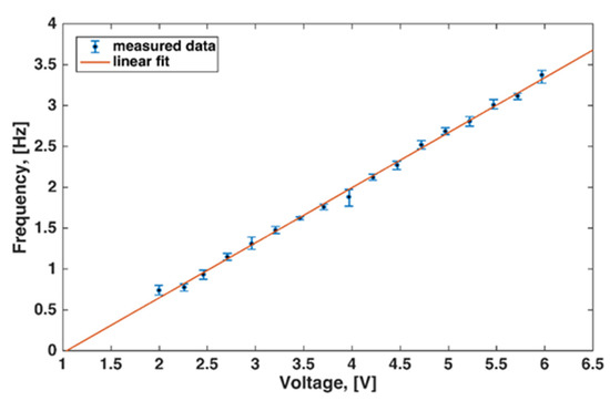 The corresponding values of supplied voltage and measured frequency are reported in Table 4, while Figure 9 highlights a strong linear correlation between voltage and frequency . In this regard, Pearson’s correlation coefficient (PCC) [41] was calculated, and a value very close to 1 was recorded. This is indicative of a strong positive linear correlation [41] between applied voltage and tail beat frequency. Therefore, the relation between voltage and frequency can be approximated as shown in Figure 9.