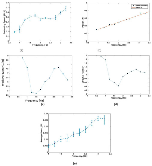 Figure 11e shows that the thrust increased linearly with the tail beat frequency. It reached a maximal value of at a tail beat frequency of and was almost the same for the tail beat frequency of (). In this case, Pearson’s correlation coefficient was equal to , and the equation of the best linear approximation was: