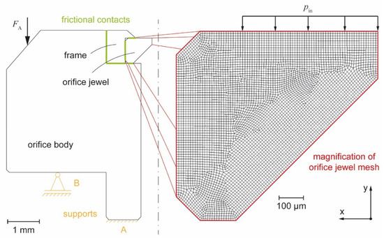 Even if the details of the interaction of individual particles with the orifice jewel surface were not modeled, the damaging effect of particles on orifices is clear. The impact of particles induces stress in the region of the orifice bore, which locally leads to material failure, i.e., initiation of cracks in the sapphire. High loads are particularly critical in the orifice bore since, in additional to the operating pressure, loads are expected there due to the flowing fluid because of the quasi-stationary state of cavitation. The presence of cavitation load is proven by many authors, such as Hashish [
