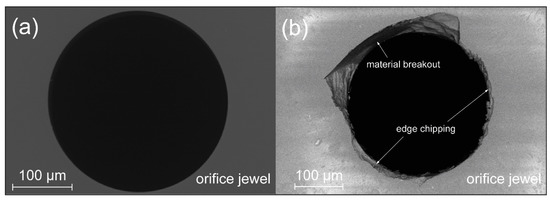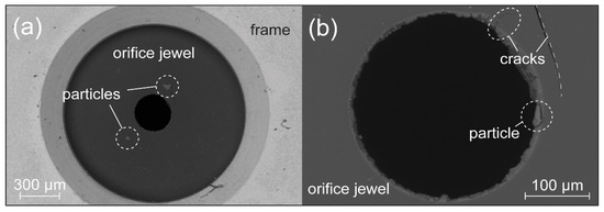 Figure 7b demonstrates the influence that particles can have on the orifice jewel, where a larger crack is present on the surface, and a small crack around the orifice bore can be noted. Both cracks have already exceeded the estimated critical crack length of