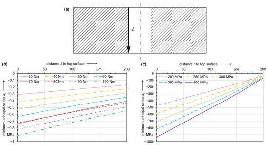 27]. Along the orifice bore, only compressive stresses are present. They exhibit a local maximum directly at the edge of the orifice bore and decrease with increasing distance from the top surface. By convention, compressive stresses are plotted negatively, so the compressive stress with the highest magnitude is equal to the minimum principal stress. Higher tightening torques lead to higher compressive stress, but they are about three orders of magnitude lower than the material strength. The calculated stresses due to assembly are negligible, and thus it is extremely unlikely that a tightening torque exceeding the specification by a reasonable amount will lead to damage to the orifice jewel.
