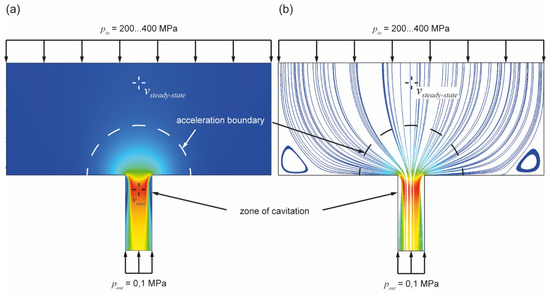 Upon impact, particles transported in the water can locally change the state of stress resulting from the operating pressure. Particles cause short-time discontinuous effects during operation. Particles follow the direction of the water flow through the orifice. For the modeling of the interactions of particles and the orifice jewel, the characteristics of the flow field around the orifice bore were obtained from numerical simulation. The flow field for operating pressures between 200 and 400 MPa was modeled as a steady-state one, i.e., it represents the condition in operation of a water jet cutting system after a sufficiently long time after actuating the pump and cutting valve.