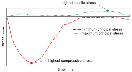 Figure 14 qualitatively shows the induced stress at particle impact over time. For further investigation, the time points with the respective highest magnitude of tensile and compressive stresses were determined, as it was not known a priori which stress state is critical for failure. The two maxima occur at different times so that both principal stresses never have their maximum value at the same time.