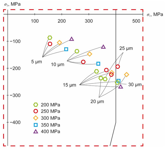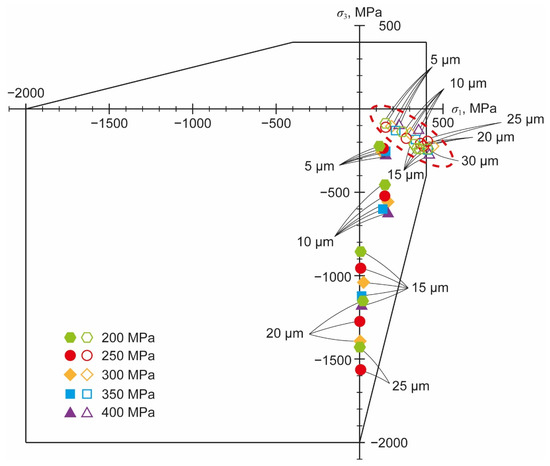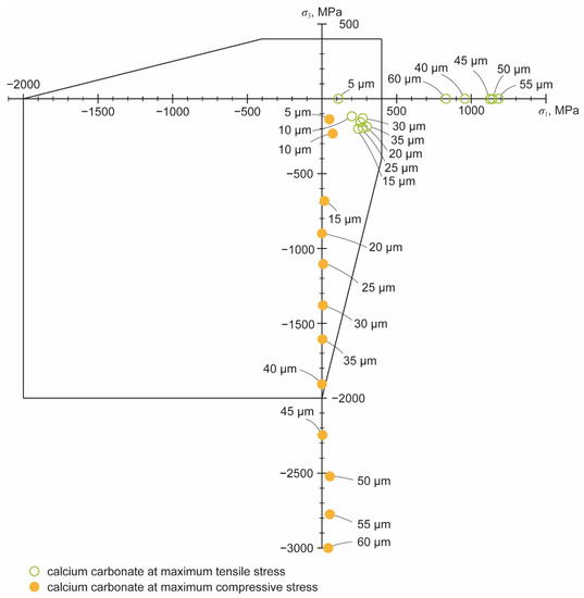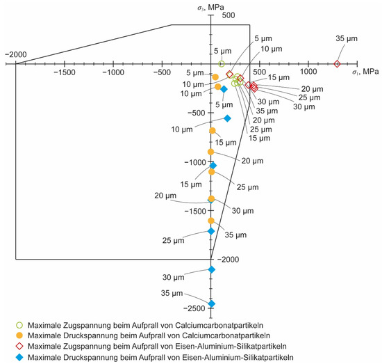 For the carbonate particles at an operating pressure of 300 MPa, the limit of acceptable particle size appears to be around 30 µm. At this diameter, the principal stress is not yet outside the envelope at the moment of either the greatest tensile or the greatest compressive stress. With a particle diameter of 40 µm, the third principal stress at the moment of the highest compressive stress is still inside, but the first principal stress at the moment of the highest tensile stress is outside the envelope. Next, for particle diameters of 30 µm and below and an operating pressure of 300 MPa, silicate particles of the same diameters were added.