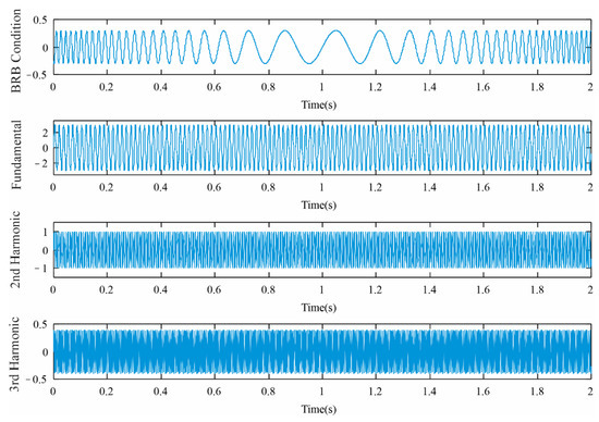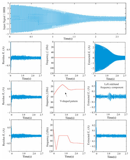 The configuration parameters of the proposed methodology are selected as follows: a frequency range of [4, 120] Hz, such frequency range includes the range where the frequency-moving component associated with the BRB fault occurs; however, for other applications the frequency range and, consequently, the filter must be adapted to include the harmonic component of interest. In this case, in order to show that other components that can be present in the input signal do not compromise the proposal performance, the third harmonic of the fundamental frequency is intended to be discriminated since it is outside the selected frequency range. A frequency rate of change of = 60 Hz/s is chosen since the chirp-type signal that is required to be extracted changes at a similar rate. The number of components to be extracted from the input signal is set to 3. Nevertheless, this number can be modified to extract more or less components as the user requires. If the user selects more frequency components than the existing in the input signal, the method will output noise in the additional components.