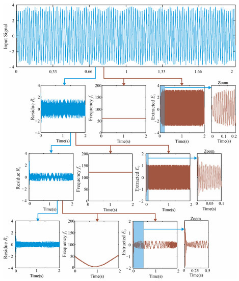 This step considers the frequency trajectory, , of the main component and extracts it from the input signal, . This action is performed by a second-order band-pass filter. Thus, the input signal is decomposed into an extracted component, , and a residue signal, . The second order band-pass filter is defined by means of Equation (7).