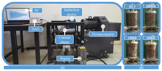 After observing the obtained results from the simulation stage, a test system was developed to validate the performance of the proposed methodology with real current signals. The experimental setup is presented in Figure 9a. The three-phase induction motor model WEG-00136APE48T was used, having a nominal power of one hp, two poles, and 28 bars. The system was connected to a power supply of 220 Vac at 60 Hz. The mechanical load was applied by means of a four-quadrant dynamometer model 8540 from LabVolt. For data acquisition, the current signal from one phase of the induction motor was monitored with a current clamp model i200 from Fluke Corporation, where the data acquisition system (DAS) was based on the NI-USB 6211 from National Instruments. The sampling frequency was set at 1500 samples/s, where 20 tests for each condition were carried out for statistical purposes. Four rotor conditions were analyzed in the experiment: healthy (HLT), incipient failure of half broken bar (HBRB), and consolidated faults with one (1BRB) and two (2BRB) broken bars. For this purpose, the rotor bar faults were artificially induced by drilling a half bar hole, one bar, and two adjacent bars, respectively. The rotors with the induced damage are presented in Figure 9b. The overall methodology was implemented on MATLAB (version 9.11 R2021b from Mathworks, Inc., Natick, MA, USA).