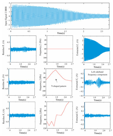 The simulation results are shown in Figure 5. The first row shows the input signal which is the sum of all the components shown in Figure 4. The second row shows the FBASD outputs for the first iteration. It consists of the residue signal, , the frequency tracking, , and the extracted component, . This extracted component corresponds to the fundamental component, . The third row is composed of the residue signal, , the frequency tracking, , and the extracted component, . In this case, the extracted component is the first harmonic component, . Finally, the fourth row is composed of a residue signal, , a frequency tracking, , and the extracted component, . In this iteration, the extracted component matches the chirp-type component, , which emulates the BRB condition. It is worth noting that the proposal first extracts the components with the bigger amplitude and the smallest ones are detected at the end. The component is discriminated by the proposed FBASD method since it oscillates at a frequency of 180 Hz which is outside of the user-defined frequency range, i.e., [4, 120] Hz.