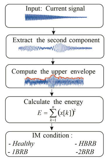 Once the proposed decomposition algorithm has obtained the main components of the measured current signal from the IM, the next step is to develop a stage of signal classification. This stage consists of analyzing the components extracted in order to automatically determine the IM condition (HLT, HBRB, 1BRB, and 2BRB). The components extracted from the signal correspond to the tracking of the main frequencies present in the current signal, since the first component is related to the fundamental frequency of the power supply (around 60 Hz) [13], the classification analysis will focus on the second extracted component that corresponds to the IM fault. In previous works, it has been reported that the spectrogram of a current signal shows that the amplitude of the frequencies associated with fault broken rotor bars increases according to the degree of damage [40]. Consequently, the amplitude of the second decomposition component, which is associated with the motor failure component, also should gradually increases according to the degree of severity in the IM.