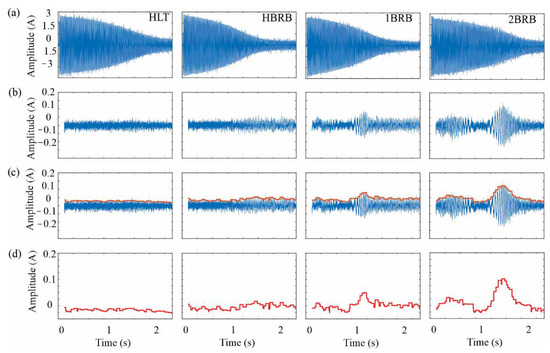 As mentioned in previous sections, a total of 80 tests were performed during the startup transient, i.e., 20 for each IM condition (HLT, HBRB, 1BRB, 2BRB). Next, according to the proposed FBASD algorithm, the second component of the signal in the time domain is extracted. Then the upper envelope is computed by a quantizing step where constant segments at the local maximum values are fixed. That is, all the local maximum or peak values in the component are searched and every maximum will remain as a constant value in the envelope signal until a new local maximum value is found, so the resulting envelope signal is a piecewise signal of constant values. In more detail, if the component A has m peak values located in the samples , , , …, , then the upper envelope is a signal of the same length as A that satisfies for , , and corresponds to the initial sample of A. Therefore, the amplitude of the constant segments is variable and is determined according to the waveform of the signal, that is, the envelope is defined according to the distribution of existing peak values in the signal. Figure 15 shows an example of the computed envelopes for each IM condition.
