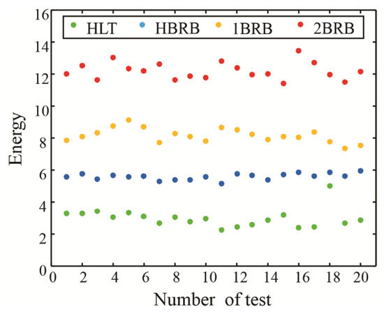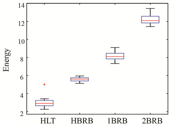 In Figure 15d, it can be seen that the amplitude of the component increases according to the degree of severity in the broken bars, as indicated by the background discussed. To quantitatively corroborate this phenomenon, the energy of the resulting envelopes is calculated. The results of the calculated energy values for the 80 tests performed are shown graphically in Figure 16. Table 3 shows the corresponding mean and standard deviation values for each rotor condition.