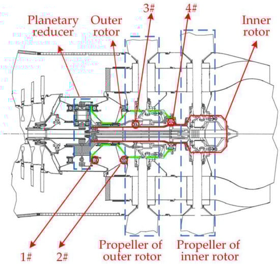 In addition to the dual-rotor system commonly found in turbofan and turbojet engines, there are some special coaxial counter-rotating dual-rotor aero engines for helicopters, transport aircraft, and bombers, such as the open-rotor engines from Ukraine, Rolls-Royce (UK), GE (USA), Boeing (USA) and SNECNA (France) [22,23,24,25]. The dual-rotor structure is connected to the aero engine core through a planetary reducer, and the output end is connected with the propeller in a cantilever structure. The research objects of this paper are the cantilevered coaxial counter-rotating dual-rotor systems of the open-rotor engine.