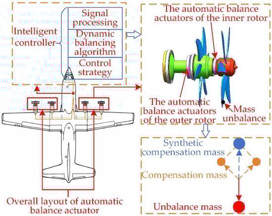 The automatic balance actuator of the inner and outer rotor is placed at the inner and outer rotor fan end near the paddle hub and connected to the intelligent controller through the signal transmission device to form the dual-rotor automatic balance system. The intelligent controller contains signal processing, dynamic balancing algorithm, and control strategy, with real-time monitoring, unbalance calculation, and actuator control command output function. The controller command is received by actuators and then makes the compensation mass disk run to the target position to generate a synthetic compensation mass to suppress unbalanced vibration caused by mass unbalance in real time. The cantilevered coaxial dual-rotor automatic balance system is demonstrated in Figure 2. At present, the dual-rotor automatic balance system has some research difficulties, such as a slow signal acquisition and complex control strategy.