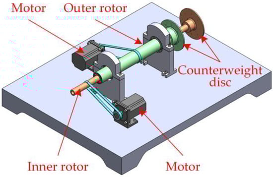 According to the structure shown in Figure 1, a cantilever dual-rotor test bench was designed as shown in Figure 4. In order to adjust the relative position of the inner and outer rotors, the rotor was designed as a bare shaft with the following parameters: the inner diameter of the inner rotor was 18 mm, the outer diameter was 30 mm, and the length was 800 mm. The inner diameter of the outer rotor was 50 mm, the outer diameter was 60 mm, and the length was 500 mm. The inner and outer rotors and counterweight discs were made of 45 steel with a mass density of 7850 kg/m3, a modulus of elasticity of 206,000 N/mm2, and a shear modulus of 79,230.8 N/mm2.