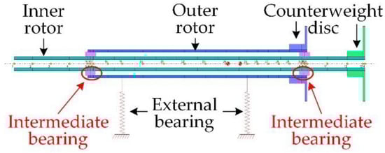 The traditional coaxial dual-rotor system with a high-pressure rotor and low-pressure rotor is widely used in the field of aero engines. However, the cantilever coaxial dual-rotor system at the output of open rotor engines and the coaxial output turboshaft engines has limited application. The power of the open rotor engine and the coaxial output turboshaft engines is output to the planetary gear reducer through the power turbine. Then, the power is distributed by the planetary gear reducer to the two output shafts, which drive the propeller rotation. It should be noted that the inner and outer rotors system at the output end is cantilevered. The inner and outer rotors are connected by intermediate bearings, and their vibration response affects each other, leading to the vibration coupling of the dual-rotor-support-casing system. The unbalanced vibration of the rotor system is a crucial factor affecting the reliability of the aero engine. Significant stresses and deformations can be caused by excessive unbalance, which can loosen the connections, load the bearings beyond the allowable range, and damage the engine [1,2]. In order to reduce the engine vibration and improve the safety, reliability, and lifetime of the engine, it is necessary to study the unbalanced vibration mechanism, vibration suppression strategy, and vibration suppression method for the dual-rotor system.