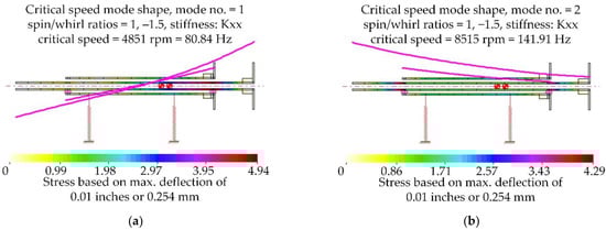 Performing a critical speed analysis of this specific rotor in DyRoBeS, Figure 6a revealed the lowest critical speed of 4851 rpm, Figure 6b revealed the second-order critical speed of 8515 rpm. The highest speed of the test bench designed in this study was 1100 r/min. The rotor can be considered as rigid in this speed range.