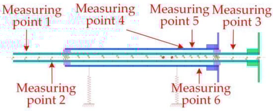 The steady-state response of different nodes was analyzed to determine the sensitivity of each node to unbalance so as to provide guidance for the establishment of actual measurement points. Here, firstly, the letter n was defined to represent the ratio between the outer rotor speed and the inner rotor speed. A positive n meant that the rotation direction of the inner and outer rotors was the same, and a negative n meant that the rotation direction of the inner and outer rotors was opposite. Under the condition of n = −1.5, the same size of unbalance was applied to the inner and outer rotor counterweight discs, respectively, in this section, and the unbalance response was obtained by a steady-state analysis at each measurement point. According to the test bench, the eddy current sensor locations were at the proposed inner rotor nodes 2, 4, and 11 and at the outer rotor nodes 26, 27, and 28, as the available measurement points of the sensor. Measuring point 1 corresponded to node 2, measuring point 2 corresponded to node 4, measuring point 3 corresponded to node 11, measuring point 4 corresponded to node 26, measuring point 5 corresponded to node 27, measuring point 6 corresponded to node 28, and the specific measuring points were as shown in Figure 7.
