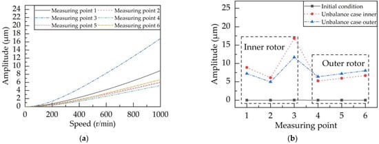 By adding the same unbalance mass to the inner and outer counterweight disks, respectively, the steady-state response of the dual rotor system at different measuring points under the unbalanced force was studied. The unbalance of the simulation was 2599 gmm, and the measured response corresponded to a speed of 1000 r/min (inner rotor speed). When the inner rotor was unbalanced, the steady-state response of each measured point was as shown in Figure 8a. When the unbalance was on the outer rotor, the steady-state response of each measured point was similar to Figure 8a. The unbalanced vibration response under all operating conditions is shown in Figure 8b, and the corresponding unbalanced vibration response data are shown in Table 1.