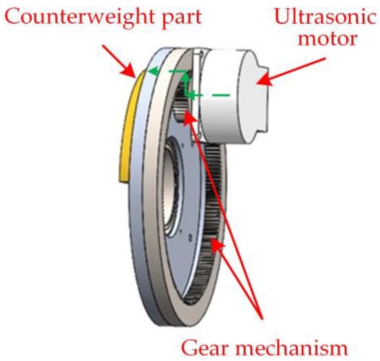 The automatic balance actuator is divided into two parts: the rotating ring and the fixed ring. The rotating ring consists of a gear component consisting of the planetary wheel–inner gear ring and a counterweight component, as shown in Figure 10. The gear component includes a planetary gear-ring gear. The counterweight component includes a counterweight block–counterweight disc. When the ultrasonic motor is started by infrared remote control, the counterweight component is driven to rotate through the meshing drive of the gear component, which makes the counterweight block reach the target position. Among them, a double-stop centering connection structure is designed between the rotating ring and the fixed ring on the end face of the inner gear ring and the counterweight disc, respectively, to ensure the stability of torque transmission. When the actuator is in operation, the balanced rotor is also rotating, so the bearing connection between the balanced rotor and the rotating ring is chosen. At the same time, the bearing also plays a supporting role in the counterweight components.