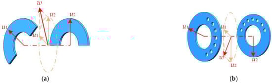 Based on the principle of the double-sided dynamic balance method, the balancing actuator has two disks on the left and right, corresponding to the space of two calibration fronts, respectively. The front of the calibration is perpendicular to the rotor axis, where the center of gravity of the counterweight is located. The eccentric mass can be formed in two ways: by adding weight and reducing weight. The counterweight block can be installed on the side of the counterweight plate, or the counterweight plate can be reduced in weight by punching a hole on one side of the counterweight plate, as shown in Figure 11. The vectors and are generated in the left and right discs, respectively, and the resulting vector is synthesized to compensate for the unbalanced vector of the rotor being balanced.