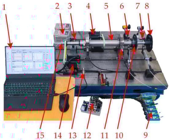 Dual-rotor test bench: 1. computer; 2. frequency converter; 3. eddy current sensor; 4. motor of the inner rotor; 5. outer rotor; 6. eddy current sensor; 7. eddy current sensor; 8. counterweight discs; 9. front end circuit; 10. counterweight discs; 11. acceleration sensor; 12. NI; 13. photoelectric sensor; 14. motor of the outer rotor; 15. inner rotor.