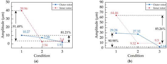 Coupled vibration suppression effect under differential speed. (a) n = −1.5; (b) n = −1.2. The horizontal coordinate 1 represents the initial state, the horizontal coordinate 2 represents the dynamic balance of the inner rotor, and 3 represents the dynamic balance of the outer rotor.