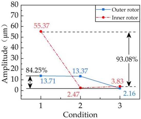 The operating speed of the outer rotor was 1500 r/min, and the speed of the inner rotor was controlled at 1250 r/min. The vibration suppression test was carried out according to the vibration suppression test procedure with a speed ratio of −1.5. The initial vibration and residual vibration of the inner and outer rotors are shown in Figure 13b.