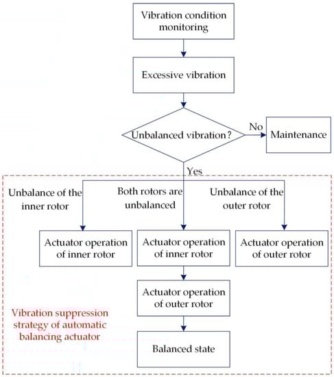It can be seen from the effect of the coupling vibration suppression in Figure 13 and Figure 14 that balancing the inner rotor first causes the vibration amplitude of the outer rotor to decrease synchronously. From the perspective of coupling vibration, when the speed ratio is −1.5, the inner rotor is balanced, and the vibration of the outer rotor is reduced by 26% synchronously. When the speed ratio is −1.2, the inner rotor is balanced, and the vibration of the outer rotor is simultaneously reduced by 7%. When the speed ratio is −1.04, the inner rotor is balanced, and the vibration of the outer rotor is simultaneously reduced by 3%. Therefore, balancing the inner rotor first to cause the vibration of the outer rotor to decrease synchronously is also desired positive feedback. From the final vibration suppression effect, the final reduction of the inner rotor vibration is 91%, and that of the outer rotor vibration is 81% for a speed ratio of −1.5. When the speed ratio is −1.2, the vibration of the inner rotor is finally reduced by 85%, and the vibration of the outer rotor is finally reduced by 90%. When the speed ratio is −1.04, the vibration of the inner rotor is finally reduced by 93%, and the vibration of the outer rotor is finally reduced by 84%. It can be seen that the coupling vibration suppression strategy obtained from the simulation is reasonable, and the vibration suppression effect is remarkable. In conclusion, the experimental results illustrated the following phenomena: (1) balancing the inner rotor can synchronously reduce the vibration of the outer rotor; (2) the step-by-step vibration suppression strategy of balancing the inner rotor first and then balancing the outer rotor can achieve the final vibration suppression effect. According to the above two phenomena, a dual-actuator step-by-step automatic balancing strategy can be formed to suppress the unbalanced vibration of the dual-rotor system, as shown in Figure 15. That is, when there is an unbalanced fault in the rotor system, the automatic balancing actuator will run in sequence according to the specific situation, thereby the unbalanced fault is eliminated.