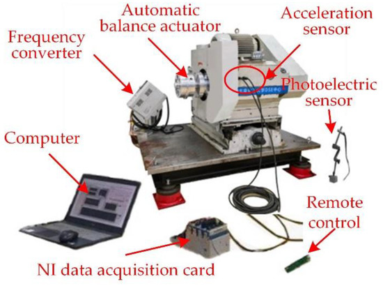 In order to verify the feasibility and effectiveness of the online automatic balance actuator, the spindle of a test bench was used as the rotor to be balanced, and the balancing actuator was installed to one end of the spindle through the connecting flange with a dummy shaft, as shown in Figure 16. The acceleration sensor was fixed to the bearing seat of the test bench by the magnetic suction base, and the vibration signal was collected in real time by the acceleration sensor. The vibration signal was subjected to a fast Fourier transformation through LabVIEW, and the displacement amplitude of the spindle was obtained by quadratic integration.