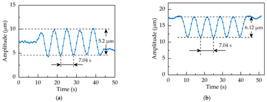 It can be seen from the amplitude curve of the spindle vibration at 1X frequency under five different rotation speeds in Figure 17 that the amplitude of the rotor vibration changes in a sinusoidal pattern under the actuator working without a break. It indicates that the actuator can achieve automatic balance. In addition, the vibration of the balanced rotor can be reduced by more than 34% in 5 s under different test speeds by using the balancing actuator, which is more substantial evidence that the actuator has a fast response speed. The fast response speed is also the most significant advantage of the actuator proposed in this paper. Therefore, the feasibility test results show that the actuator is capable of automatic balance.